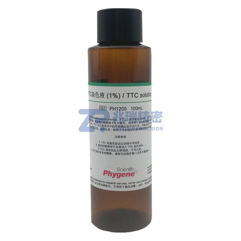 2,3,5-Triphenyltetrazolium chloride (TTC) is a fat-soluble photosensitive complex, commonly used to detect seed viability and ischemic infarction in mammalian tissues. It acts as a proton acceptor for the pyridine-nucleoside structural enzyme system in the respiratory chain and reacts with dehydrogenases in normal tissues to produce a red color. Dehydrogenases in living cells of viable seed embryo tissues can reduce TTC to insoluble, stable red triphenylformazan (TTF). If the embryo is dead or its viability is declined, it cannot be stained or only lightly stained. Therefore, seed viability can be identified based on the stained parts and the depth of staining of the embryo.