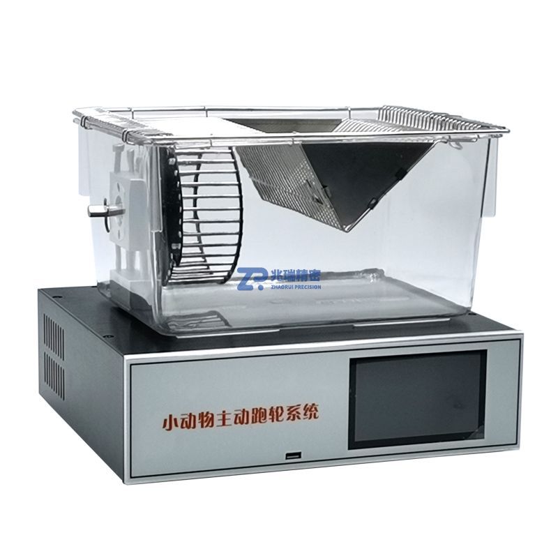The mouse voluntary running wheel system is driven by the spontaneous movement of the animals themselves to rotate the running wheel. In this configuration, information about the long-term activities of animals in the cage, such as the rotation direction, number of rotations, and cumulative total travel distance of the running wheel, can be recorded by a length meter using an encoder. This device consists of a rotating wheel assembly, a cage body, and a rotation direction and speed sensor. The instrument is an experimental tool for studying the living rhythms of animals. A feeder can also be optionally equipped for exercise reward experiments and other studies.
